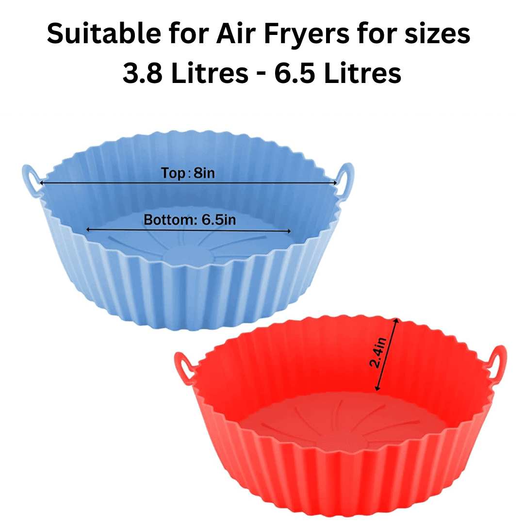 Double-basket design – includes two sizes for different air fryer models (8” top / 6.5” bottom / 2.4” height and 6.5” top / 5.5” bottom / 1.8” height).