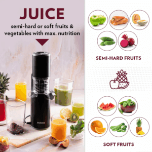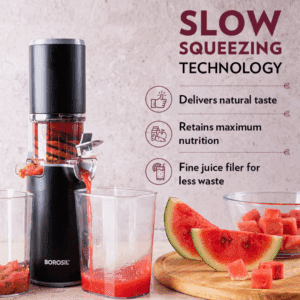 Cold press slow juicer – preserves nutrients, flavor, and natural color.