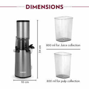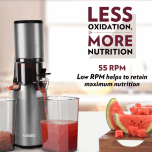 Cold press slow juicer – locks in nutrients, flavor, and natural color. Designed for semi-hard fruits & vegetables like apples, carrots, cucumbers, and beets. Compact body design – one of Borosil’s slimmest cold press models, ideal for modern kitchens. Low-speed technology provides higher juice yield with dry pulp. Quiet operation with reverse function to clear blockages. Detachable, easy-to-clean parts.