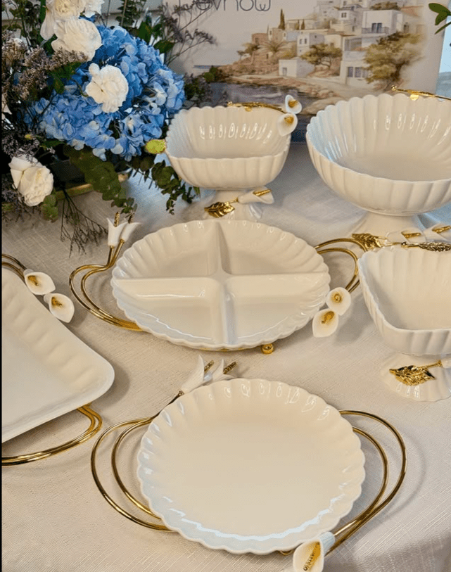 Elevate your hosting experience with the Devnow Ceramic Platter, crafted for those who appreciate timeless elegance. Designed with a pristine ceramic base and adorned with luxurious gold-finished handles and floral accents, this platter seamlessly blends functionality with sophistication.