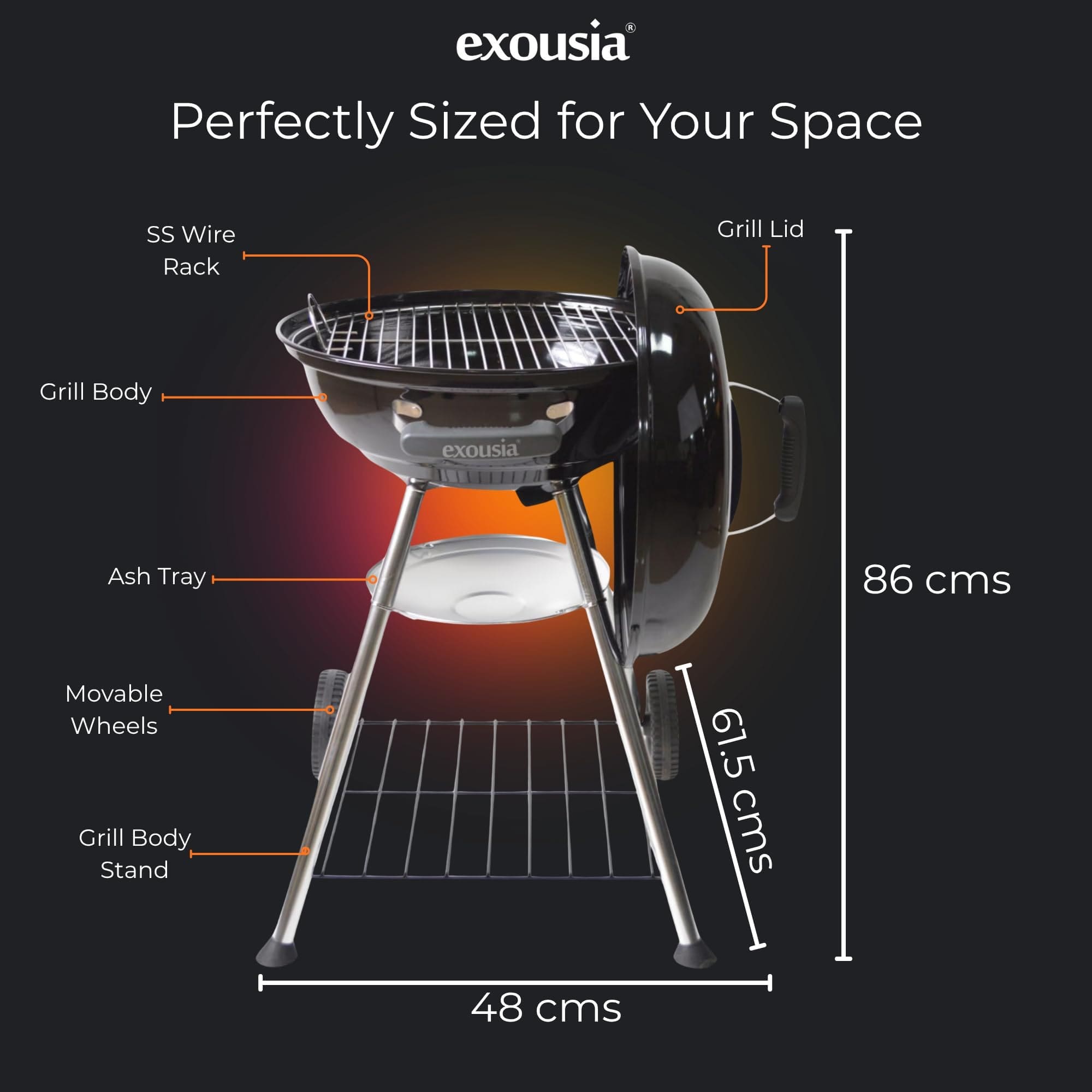 Exousia Charcoal BBQ Grill - 47 cms, Porcelain Coating Fire Bowl and Lid with 4 Legs for Sturdy Balance