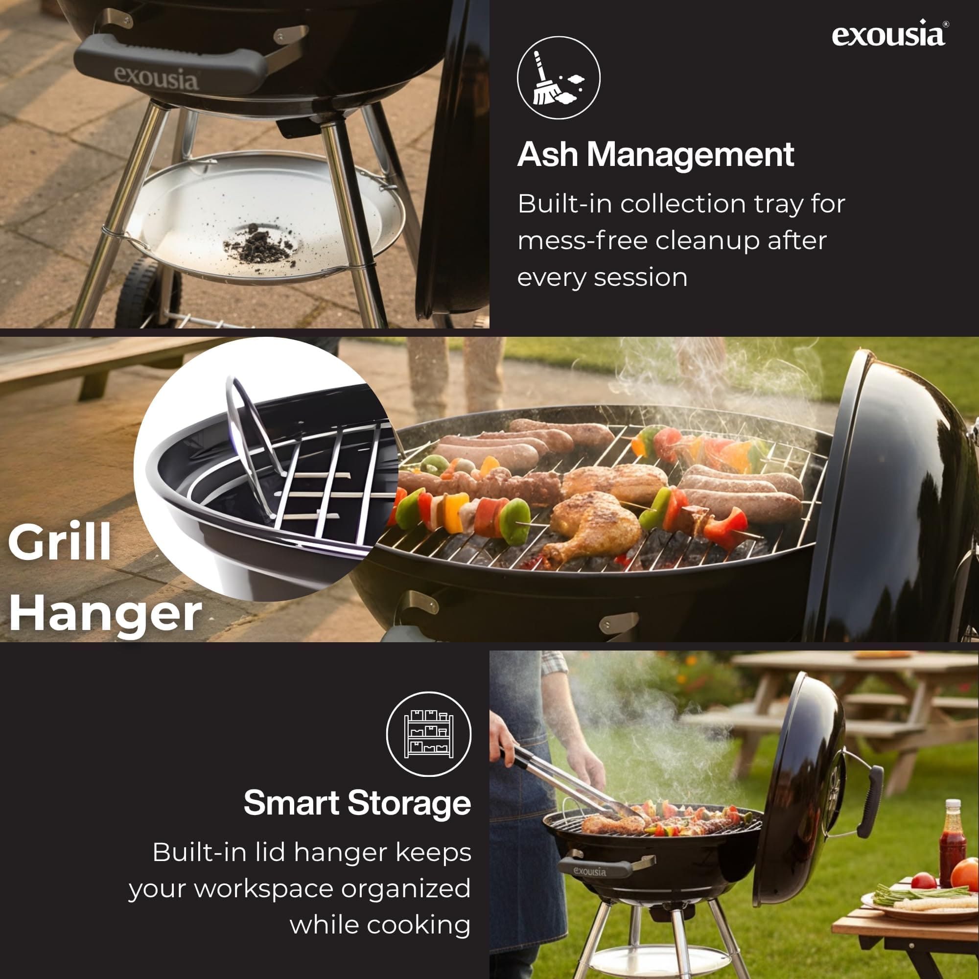 The Exousia Charcoal BBQ Grill comes with a 47 cm cooking diameter, suitable for small family barbecues or compact house parties. The porcelain-coated fire bowl and lid help retain heat evenly while resisting rust and corrosion, which is critical for charcoal cooking. Designed for direct charcoal grilling, it delivers authentic smoky flavour that gas or electric grills simply can’t replicate.