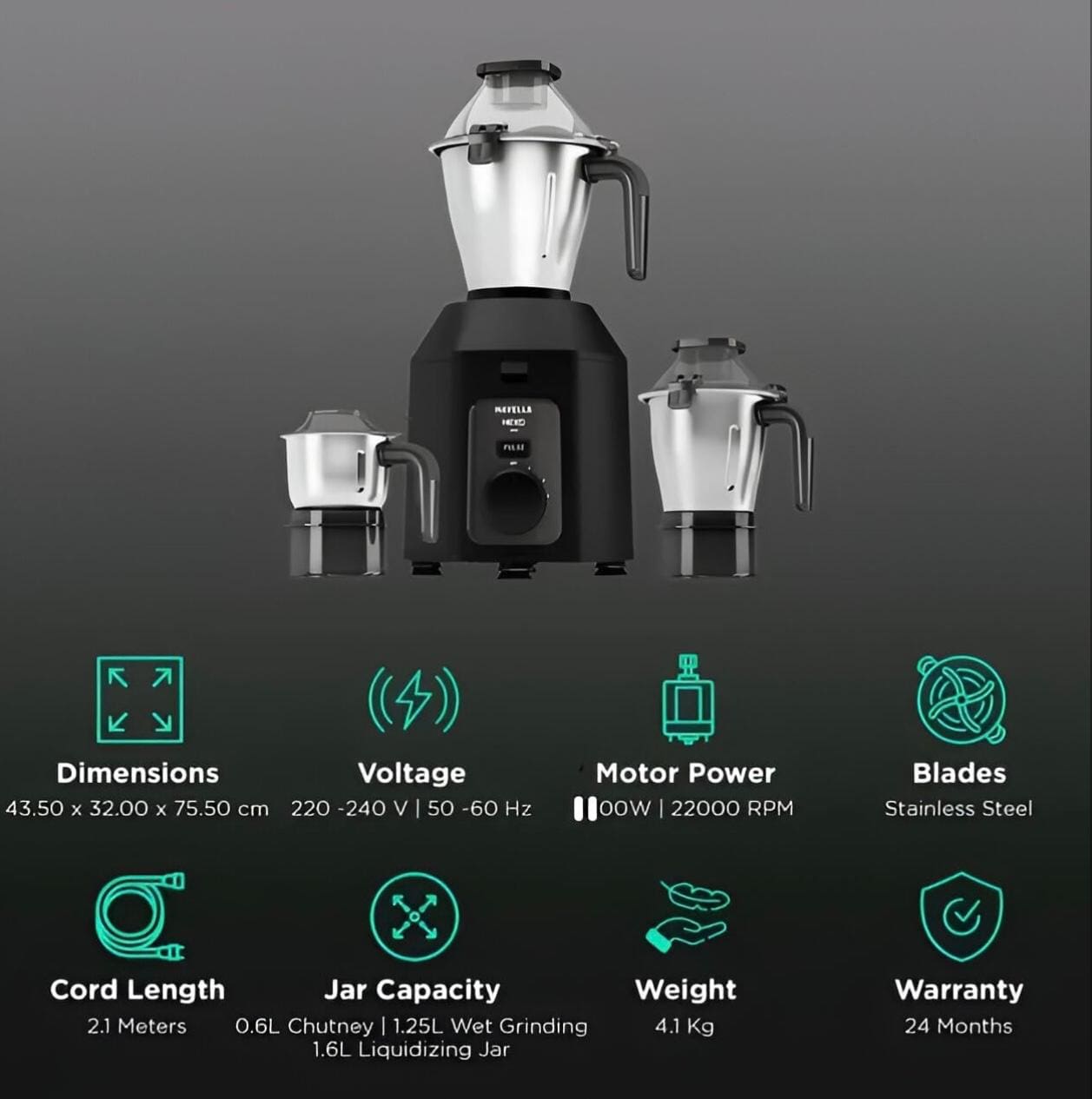 Sturdy ABS body with high-grade stainless steel jars and ergonomically designed handles. Heavy-duty motor engineered for consistent performance in Indian kitchens. Blades are sharp and durable for fine and uniform grinding.