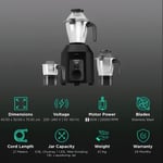 Havells Hexo Plus 1100 Watts 3 Jar Mixer Grinder| High Speed Mixie 22000 RPM motor| 100 Minutes Continuous Run Time|SS Jars with Handle| Metal Jar Base| 5 Year Motor Manufacturer Warranty