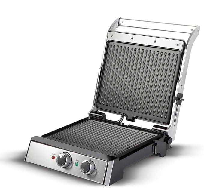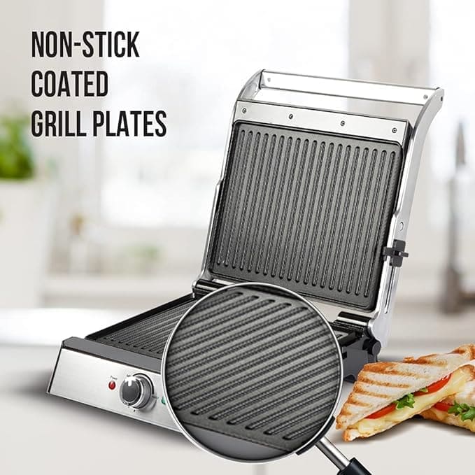 Premium stainless steel housing with reinforced hinges for long life. Heavy-duty non-stick grill plates built for repeated use. SS exterior resists stains and adds to the modern kitchen aesthetic.