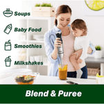 ANTI-SPLASH TECHNOLOGY: The stem is made from quality food-graded stainless steel. With blade-shield design, this hand blender ensures splash-free blending.