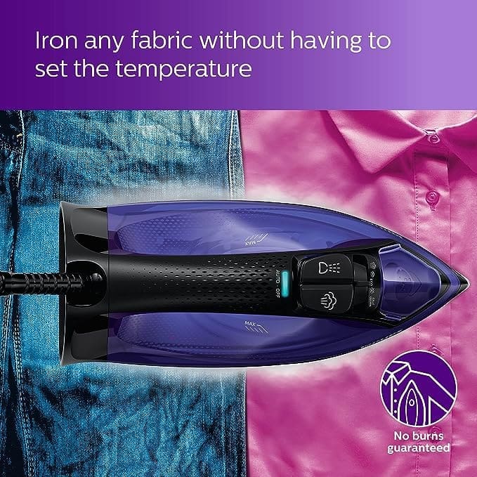 A premium Philips steam iron offering high wattage, advanced OptimalTEMP safety, and a no-burns guarantee. Excellent value for households ironing mixed fabrics.
