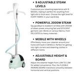 ADJUSTABLE HEIGHT & BOARD ↕️ – Adjust the steamer height from 1.0M TO 1.5M for added convenience. Plus, the FLEXIBLE IRONING BOARD transitions smoothly between horizontal and vertical positions.
