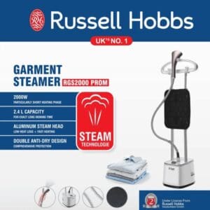 Covered by a 2-year Russell Hobbs warranty against manufacturing defects. Warranty does not cover limescale damage, misuse, or operation with untreated hard water.