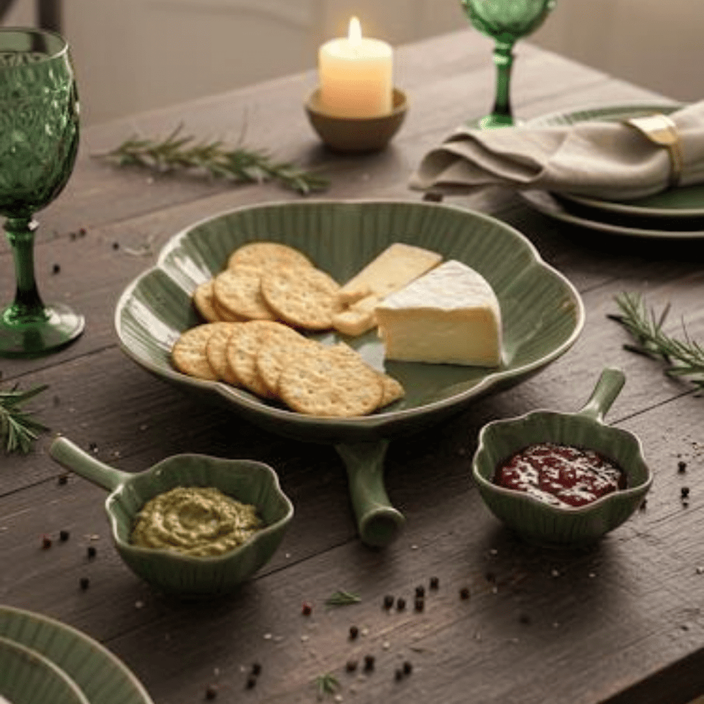 Tatva Lotus Chip and Dip Set, Ceramic Set with 1 Platter and 2 Dip Bowls
